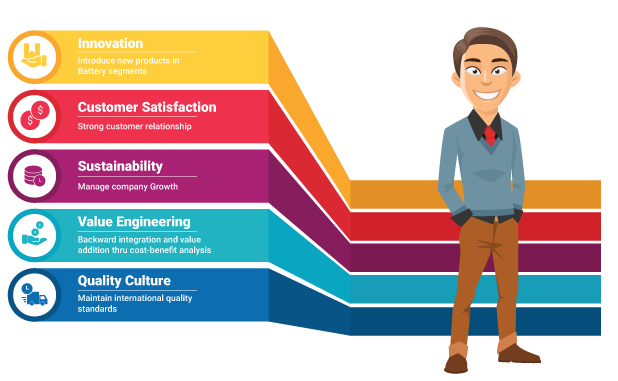Our Mission is to create a world class Battery Assembly and charging system by empowering our people for continuously upgrading technologies, innovating systems for achieving world class quality standard to satisfy and delight customer expectation.